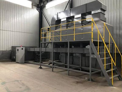 廢氣催化燃燒設(shè)備脫附后的氣體經(jīng)阻火器、進(jìn)氣閥、換熱器、電加熱器(預(yù)熱器)升溫,使氣體溫度升至催化燃燒所需要的溫度,在催化床內(nèi)的催化劑的作用下分解成水和二氧化碳,同時(shí)放出大量的熱,使氣體溫度進(jìn)一步提高,高溫氣體再通過(guò)換熱器進(jìn)行部分熱量回收后,通過(guò)風(fēng)機(jī)排出。