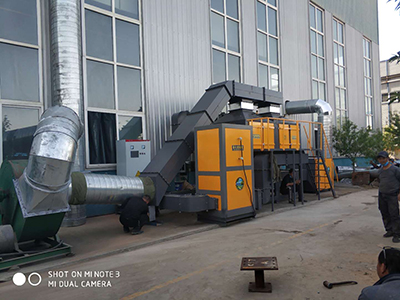 催化廢氣燃燒處理設(shè)備是將廢氣_行吸附、脫附濃縮,使得廢氣濃度合適,再到廢氣燃燒爐內(nèi)燃燒,從而降低燃燒成本。有機廢氣在引風(fēng)機的作用下通入活性炭吸附箱,由于活性炭具有微孔多、比表面積大、吸附能力強的特性,將有機廢氣吸附在活性炭的微孔內(nèi),此時潔凈空氣被排出。