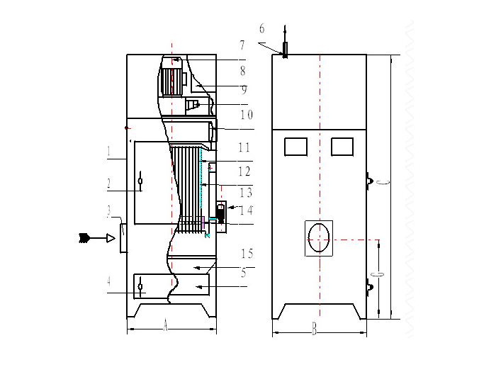 含塵氣體進(jìn)入箱體,由扁布袋過濾器進(jìn)行過濾,粉塵被阻留在濾袋外表面,已凈化的氣體通過濾袋進(jìn)入風(fēng)機(jī),由風(fēng)機(jī)吸入直接排入室內(nèi)(也可接管排至室外)。隨著過濾時間的增加、濾袋外表面沾附的粉塵也不斷增加、濾袋阻力也相應(yīng)增加,從而影響除塵效果,采用自控清灰機(jī)構(gòu)進(jìn)行定時振打清灰或手控清灰機(jī)構(gòu)停機(jī)后自動振打數(shù)十秒鐘,使沾在濾袋外表面的粉塵抖落下來,落到集塵容器(抽屜)中的粉塵由人工拉出清理。