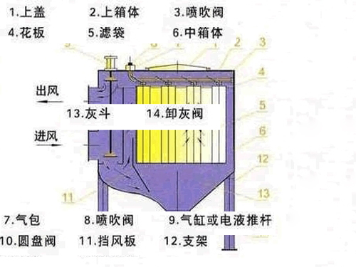 反吹(吸)風(fēng)系統(tǒng)包括反吹(吸)風(fēng)機(jī)、反吹(吸)風(fēng)管、氣缸、電磁閥、測(cè)壓裝置、閥板及壓縮空氣管路等。